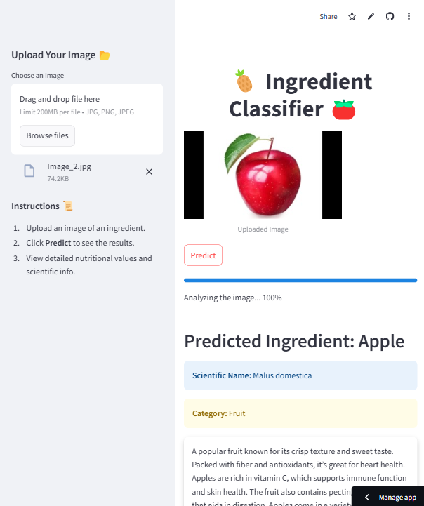 Developed a machine learning-based application that allows users to upload images of ingredients. The system accurately identifies the ingredient, displays its nutritional values, and provides a comprehensive description. The project incorporates advanced computer vision techniques to preprocess and analyze images and utilizes machine learning algorithms for classification.